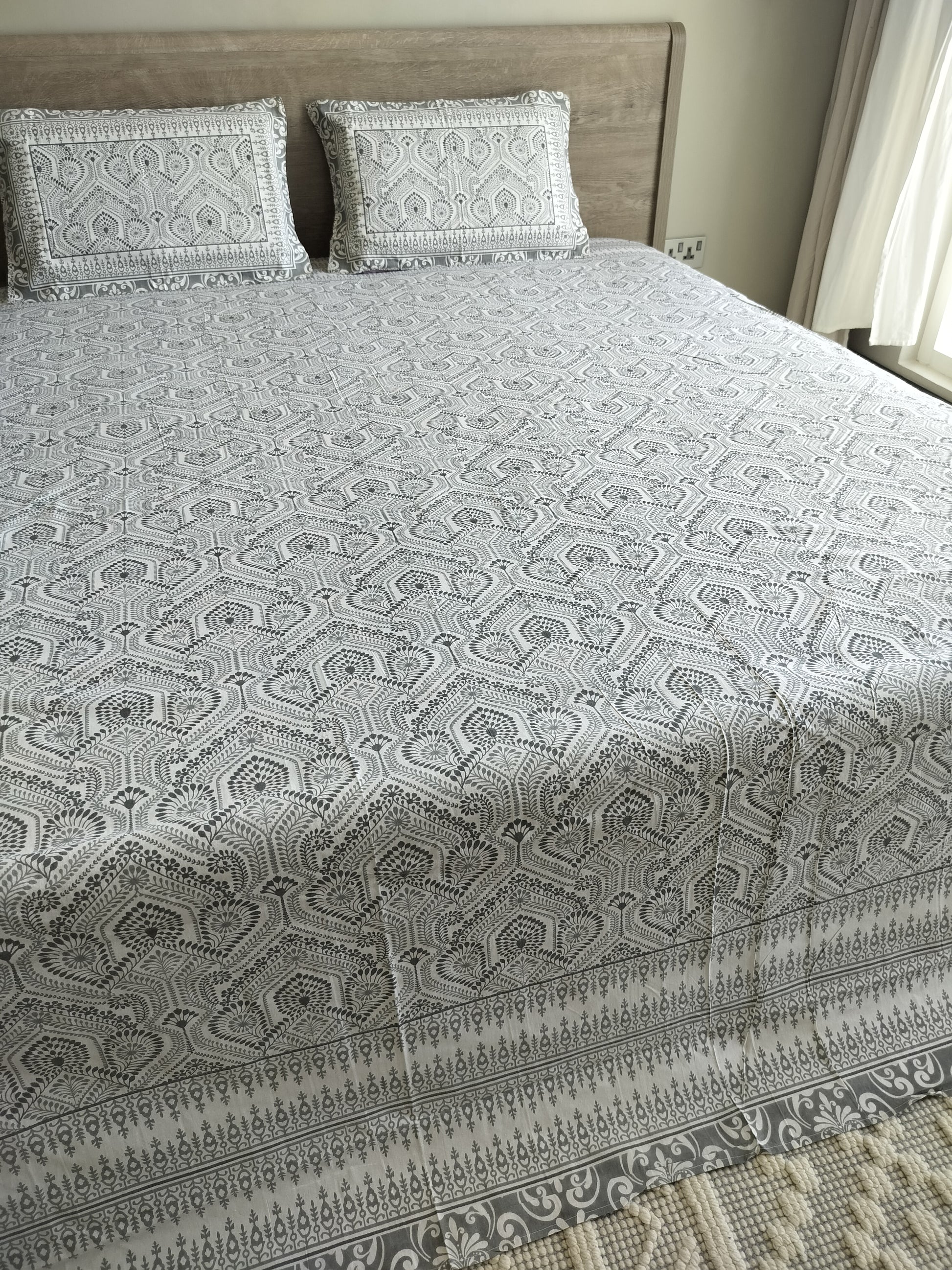 This handcrafted bedsheet in elegant grey tones is adorned with intricate hand block motifs, reflecting the artistry of Rajasthan. Made from pure cotton, it offers a soft, breathable touch along with a royal aesthetic.