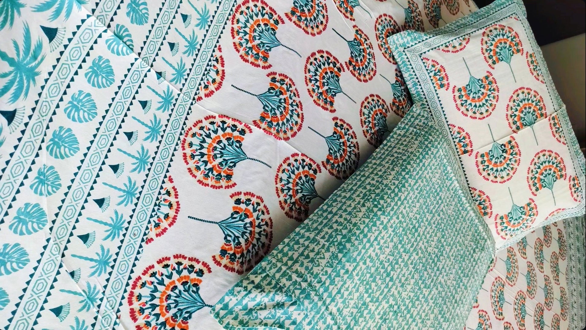A lively blend of teal, orange, and traditional block prints.